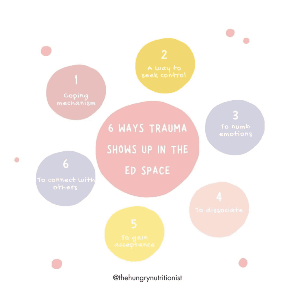 Trauma often leaves individuals grappling with intense feelings of self-blame and guilt. These emotions can arise from circumstances where individuals feel responsible for events that were, in reality, beyond their control. Unfortunately, we know that individuals who experience these emotions are more susceptible to engaging in self-destructive behaviours, including disordered eating patterns and binge eating (8)
